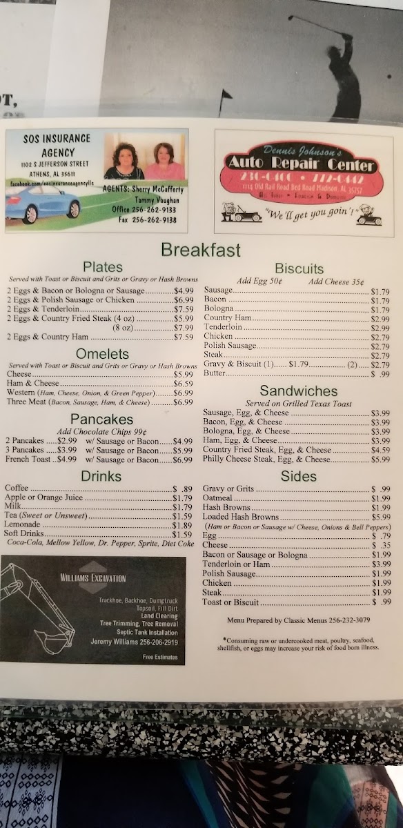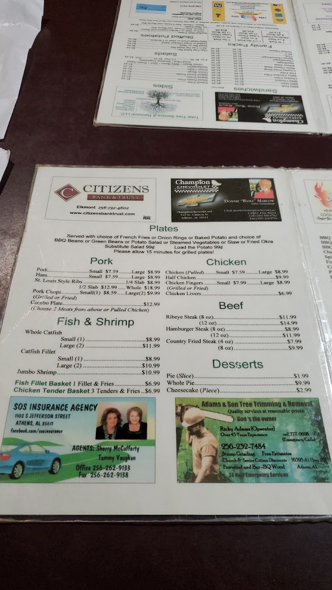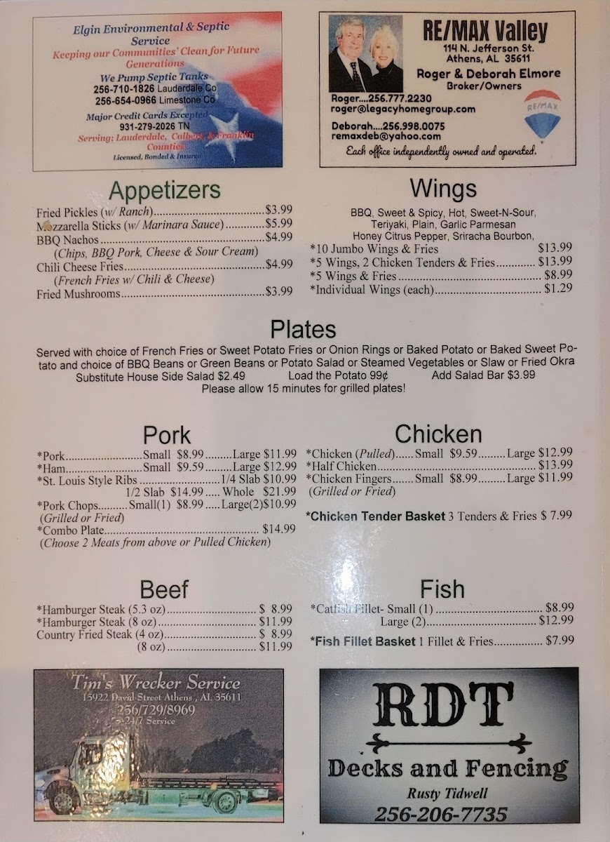 Diners often enjoy favorites like crispy fried pork chops and catfish alongside staple sides such as hush puppies and fried okra—perfect for those looking for a satisfying, familiar taste of Southern cuisine. The menu also features versatile choices like pulled pork sandwiches and BBQ pork nachos that complement the relaxed, friendly atmosphere of the restaurant. For breakfast lovers, options such as tenderloin biscuits and hearty stuffed baked potatoes provide a comforting start to the day.